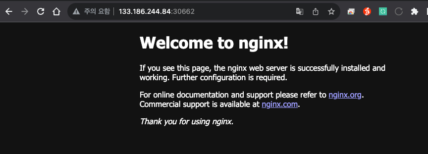 192.168.0.62의 공인 ip인 133.186.244.84의 NodePort 30662로 접근 가능하다.