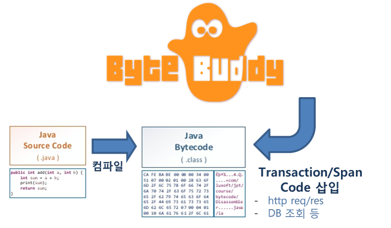 JAVA Agent는 APM 성능 데이터 수집을 위해 필요한 Code들을 Byte Buddy라는 library를 이용하여 Compile된 Application Byte Code에 직접 삽입합니다.