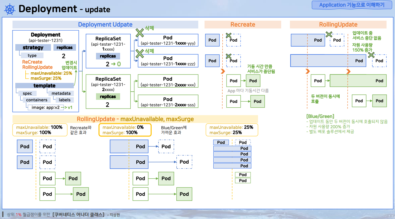 - maxUnavailable: 1 → 업데이트 중, 기존 파드 최대 1개는 비워도 됨.
