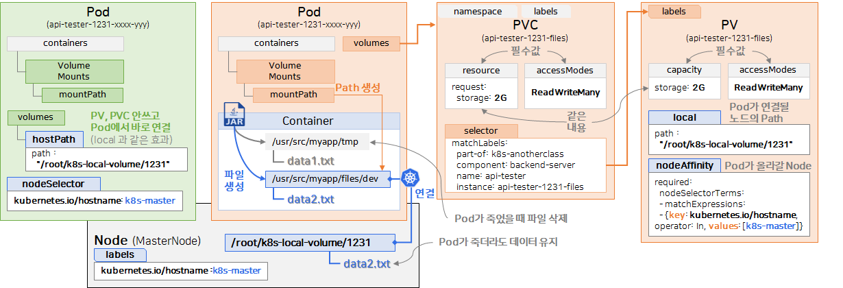 PV의 local 항목은 Pod 생성 명령어에서 volumes.hostPath와 동일하다.